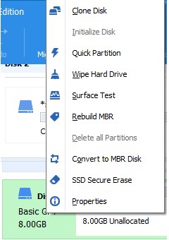 При виклику контекстного меню в програмі AOMEI Partition Assistant, на нерозміченій області жорсткого диску, будуть доступні наступні операції
