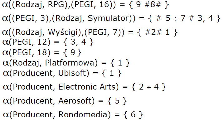 W pewnym systemie wyszukiwania informacji do zbioru atrybutów należą atrybuty Rodzaj i PEGI, a zbiory wartości tych atrybutów to odpowiednio {RPG, Symulator, Platformowa, Wyścigi} oraz {3, 12, 16, 18}. Dana jest kartoteka wyszukiwawcza