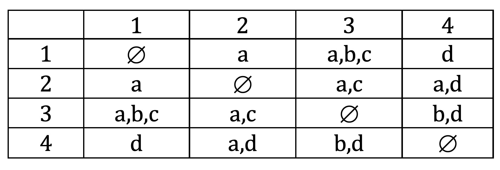 Niech dla tablicy decyzyjnej, gdzie C = {a, b, c, d} macierz rozróżnialności będzie postaci