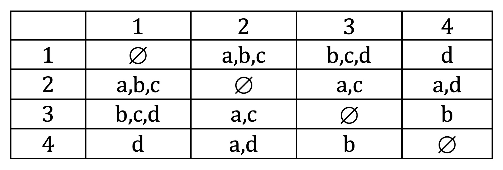 Niech dla tablicy decyzyjnej, gdzie C={a, b, c, d} macierz rozróżnialności będzie postaci