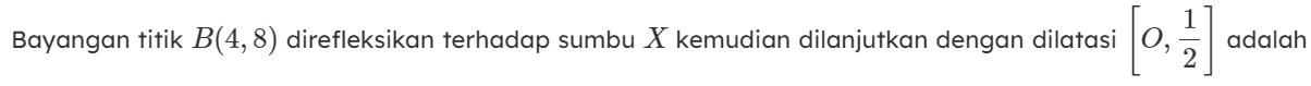Jika titik (-4,2) didilatasi dari titik O(0,0) dengan faktor dilatasi -1/2 maka hasilnya adalah....