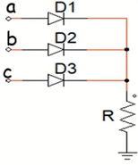 Дараах схемд харуулснаар 3 фазын шулуутгуурын оролтуудад а=5В, b=9В, c=12В хүчдэл өгөдсөн бол ачааны R дээр унах хүчдэл ямар байх вэ?