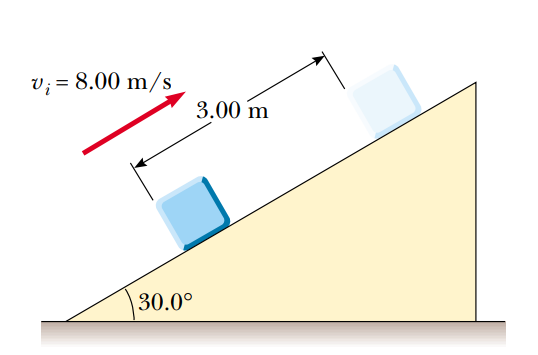 Το σώμα του σχήματος έχει αρχικά ταχύτητα 8.00 m/s. Ο συντελεστής τριβής του σώματος με το κεκλιμένο είναι 0.281. Να βρεθεί η ταχύτητα του σώματος αφού διανύσει μία απόσταση 3.00 μέτρων στο κεκλιμένο επίπεδο.