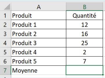 Q13 - Quelle est la bonne formule à écrire en B7 pour calculer la moyenne des quantités de B2 et B4 et B6 ? (Une seule réponse possible)