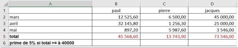 Q20 - Quelle est la formule a écrire en B6 qui permettra de calculer une prime de 5%¨du total si le total (B5) est >= à 40 000, dans le cas contraire la prime est de zéro (0). ? (Une seule réponse possible)