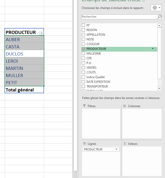 Q29 - Dans le Tableau croisé dynamique, le champs Producteur est déjà en ligne, Je vais glisser ce champs également dans la zone VALEUR. Que vais-je obtenir ? (Une seule réponse possible)