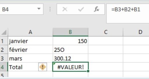 Q24 - Pourquoi la formule en B4 affiche #VALEUR! ? (Plusieurs bonnes réponses sont attendues : vous devez toutes les sélectionner pour obtenir le point)