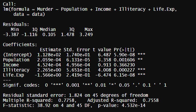 Betrachte folgendes lineares Regressionmodell, das die Mörderrate in den Vereinigten Staaten in Abhängigkeit von Lebenumständen beschreibt. Welche von den vier erklärenden Variablen (Population, Income, Illiteracy, Life.Exp) wirst du vermutlich aus dem Modell raushaun? Beurteile anhand der Testwerte, welche Variable irrelevant für das Modell ist.