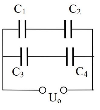 Az ábrán C1 =9 μF, C2 =18 μF, C3 =38 μF és C4 =9 μF. Mekkora a C3 kapacitású kondenzátor energiája? , ha Q2 = 76 μC?