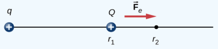 Egy +4,1 nC-os 𝑄 töltés kezdetben r1 = 8 cm távolságra helyezkedett el a + 6,4 nC-os, origóban rögzített q töltéstől (ábra). A Coulomb-erő 𝑄-t felgyorsítja, és 𝑞-tól távolodva eléri az  r2 = 19 cm távolságot. Mekkora a mozgási energiája? ( )