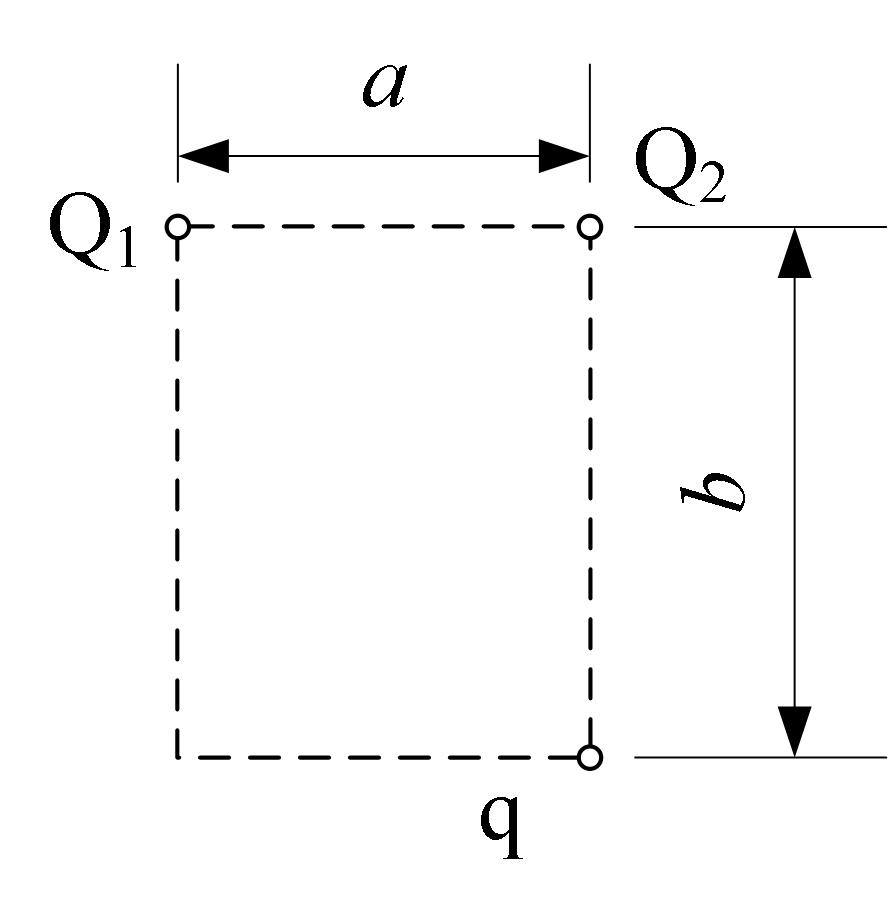 Egy a=2m és egy b=2,8m oldalélekkel rendelkező téglalap két felső csúcsába Q1=9μC és Q2=2μC nagyságú töltést teszünk. Mekkora erő hat a jobb alsó csúcsba helyezett q=137,6μC próbatöltésre mN-ban?