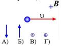 Електрон влітає в однорідне магнітне поле, перпендикулярне до напрямку його руху. Вкажіть напрямок сили Лоренца.
