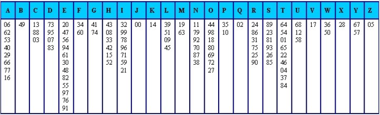 Using the Homophonic cipher and the key, represented by the table below, the cryptogram C was obtained.Find out the initial message M. C = 1075963864.