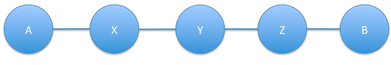 Nodurile A și B sunt gazde finale și nodurile X, Y și Z sunt routere. Fiecare legătura este de 100 metri lungime și are o rată de transmisie de 100 Mbit/s. Semnalele se propagă prin legături la viteze de 2*108 m/s. Fiecare pachet transmis de la nodul A la nodul B are o lungime de 1000 de octeți.