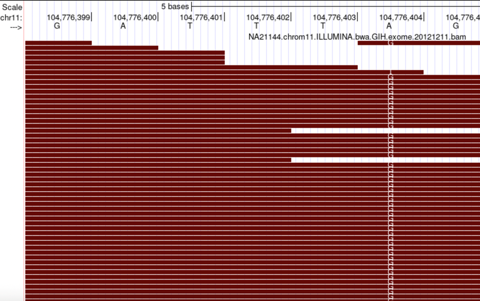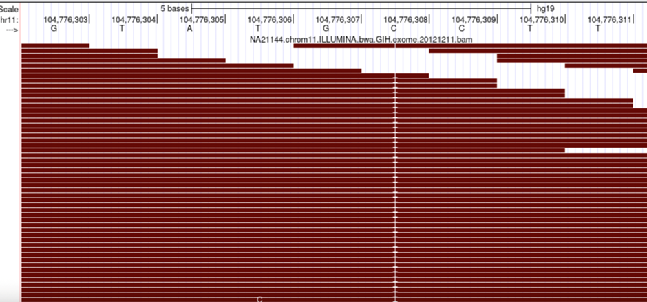 In the image below, multiple FASTQ reads are aligned to a specific genomic position represented in the BAM file. Find the variant indicated by multiple T (thymine).