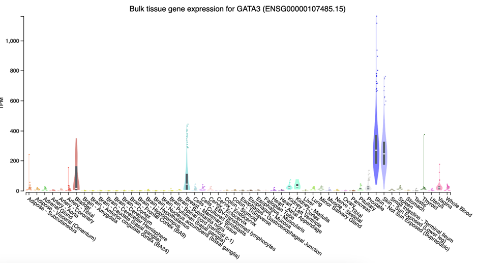 Ви бачите скріншот з порталу GTEx. На ньому показано профіль експресії гена GATA3. Яке твердження правильне: