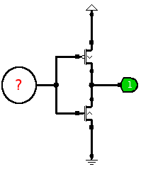 Koks įėjimas turi būt šiame Logisim tranzistorinės schemos modelyje, kad gauti parodytą išėjimo signalą?