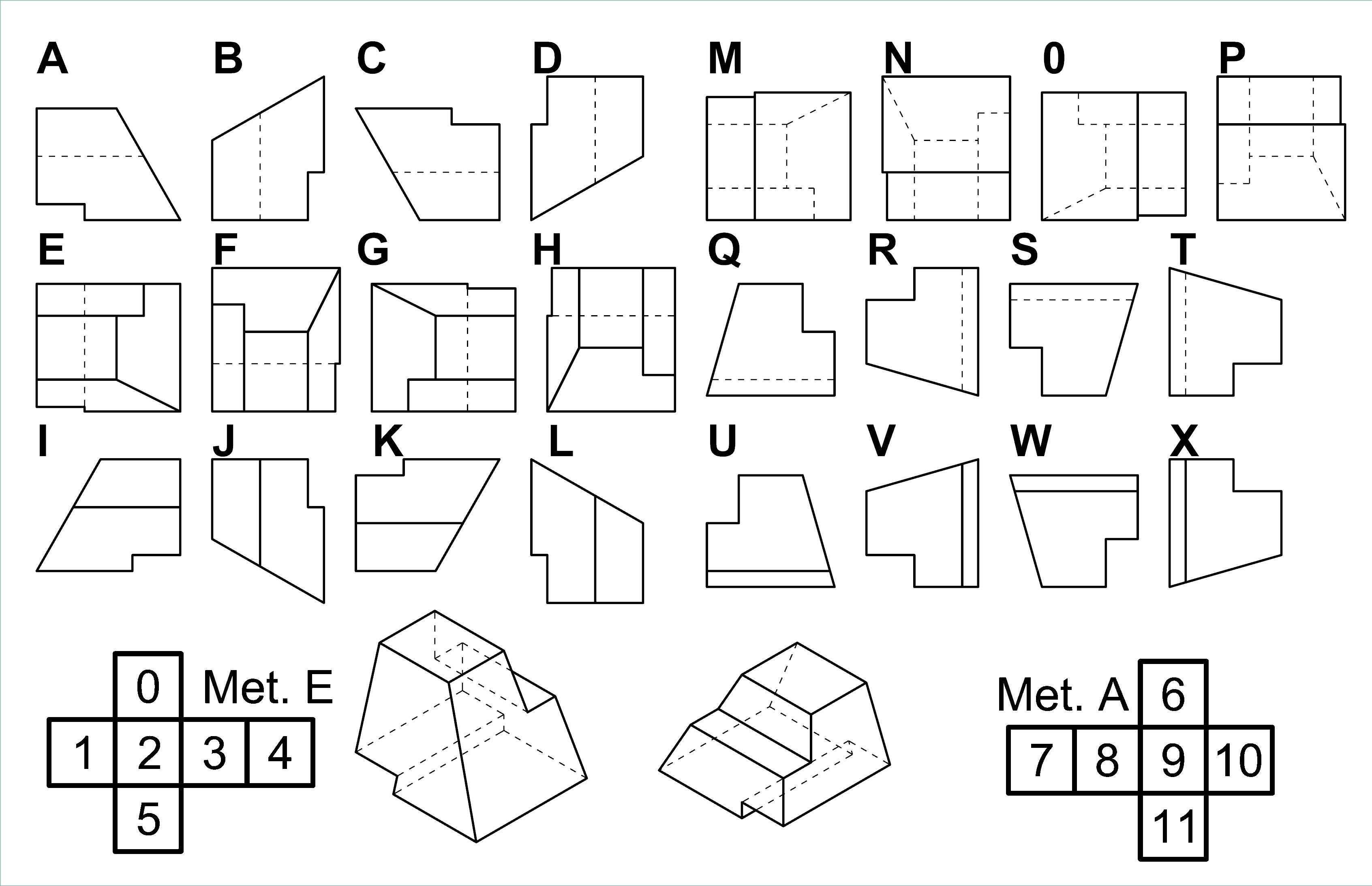 Date le seguenti viste, associare le lettere corrette ai numeri sotto rappresentati nei riquadri. Ipotizzare che al posto del numero 2 sia presente la vista C e al posto del 9 sia presente la vista identificata dalla lettera X.