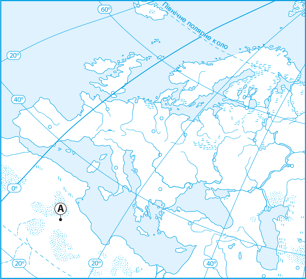 Укажіть, які географічні координати має точка А, позначена на картосхемі Європи.