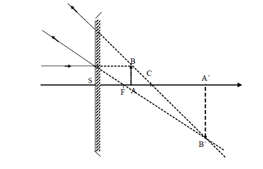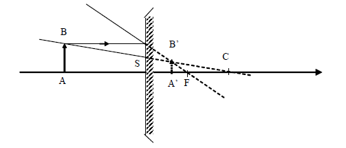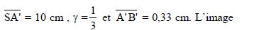 On considère un miroir sphérique convexe, de centre C, de sommet S derayon de courbure R = SC = 30 cm et un objet AB de hauteur 1 cm. l'objet est positionné à 30 cm devant le miroir. L'image est tq :