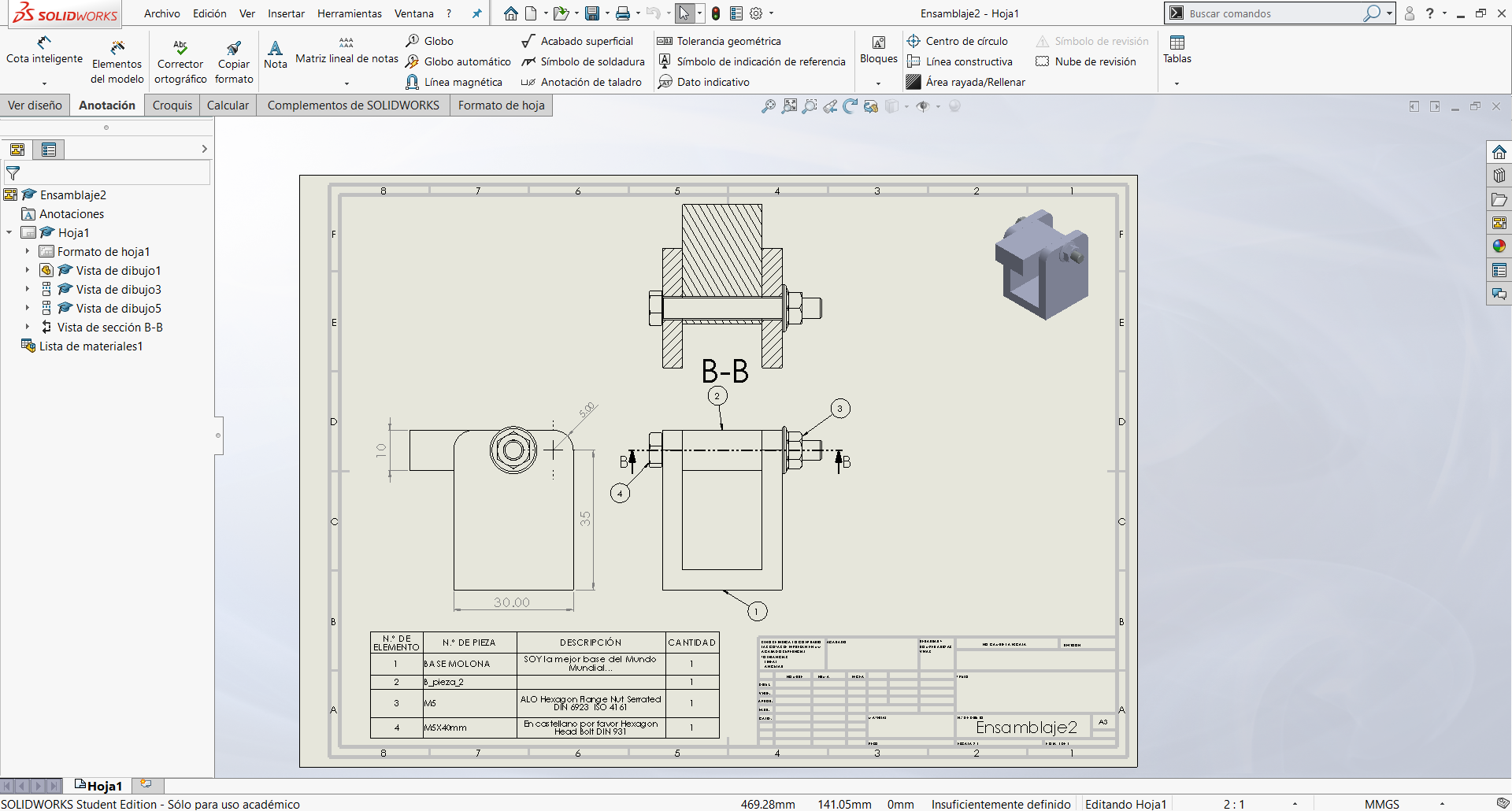 En un plano creado en SW, al usar una lista de