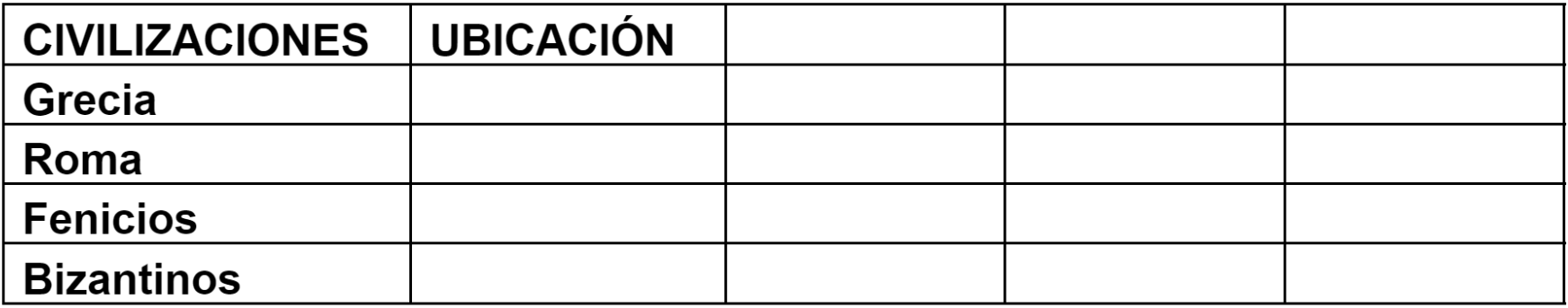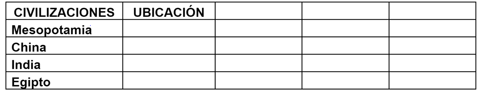 María docente de EESS quiere retroalimentar el tema de las civilizaciones del mundo antiguo y para ello está creando un cuadro comparativo, el cual se presenta a continuación.