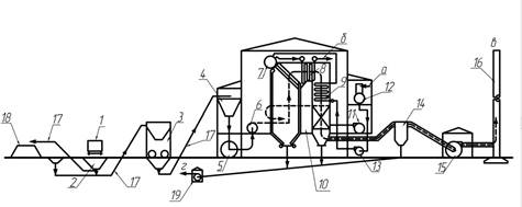 На рисунку представлена загальна технологічна схема котельної установки, яка працює на твердому паливі. Якою цифрою позначений димосос