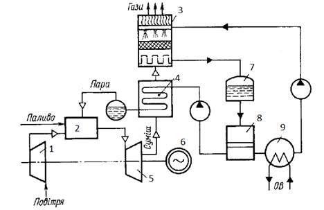 Яка позиція відповідає контактному конденсатору на схемі комбінованої парогазової турбінної установки з контактним конденсатором ?…