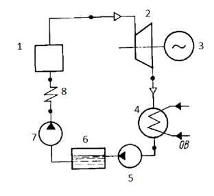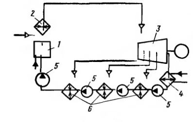 На рисунку зображена найпростіша схема паротурбінної установки з регенеративним підігрівом живильної води. Співставте цифри та обладнання, яке вони відображають: