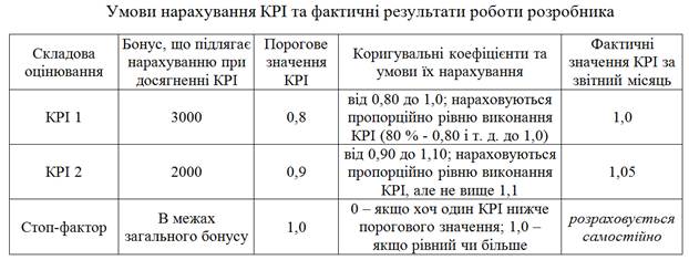 Менеджер проекту працює на умовах оцінки результатів його роботи за КРІ. Розподіл загальної суми заробітної плати (30 000 грн.) є таким: 22 000 грн. – фіксована частина, 8 000 грн.– змінна, залежно від значень КРІ. Умови нарахування КРІ та фактичні значення наведені в таблиці. Якою є змінна частина заробітної плати менеджера (грн.), визначена за результатами роботи в проекті за місяць?: