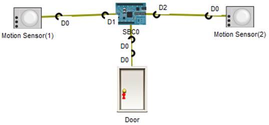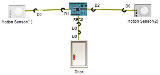 function loop() { var value = digitalRead(2); if (value > 0) customWrite(0, "1, 0"); else … delay(500);}Для наведеного вище коду мовою JavaScript для Плати SBC [SBC board] SBC0 у програмі Cisco Packet Tracer (див. рисунок) вкажіть рядок, який можна вставити на місці …, щоб за допомогою Датчика руху [Motion Sensor] Motion Sensor(2) розблокувати і відкрити та закрити і заблокувати Двері [Door] Door: