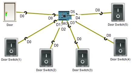 from gpio import *from time import *def main(): while True: customWrite(0, digitalRead(2)) delay(500)if __name__ == "__main__": main()Наведений вище код мовою Python для Плати SBC [SBC board] SBC0 у програмі Cisco Packet Tracer (див. рисунок) дозволяє відкрити або закрити Двері [Door] Door за допомогою Вмикача [Switch]: