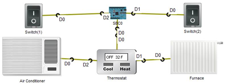 function loop() { if (digitalRead(5) > 0) {customWrite(2, 1)} else customWrite(2, 0); if (digitalRead(4) > 0) {customWrite(3, 1)} else customWrite(3, 0); … delay(500);}Для наведеного вище коду мовою JavaScript для Плати SBC [SBC board] SBC0 у програмі Cisco Packet Tracer (див. рисунок) вкажіть рядок, який можна вставити на місці …, щоб за допомогою Вмикача [Switch] Switch(1) ввімкнути або вимкнути Лампу [Light] Light та за допомогою Вмикача [Switch] Switch(2) ввімкнути або вимкнути Стельовий вентилятор [Ceiling Fan] Ceiling Fan та Зволожувач [Humidifier] Humidifier: