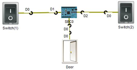 from gpio import *from time import *def main(): while True: customWrite(0, digitalRead(3)) delay(500)if __name__ == "__main__": main()Наведений вище код мовою Python для Плати SBC [SBC board] SBC0 у програмі Cisco Packet Tracer (див. рисунок) дозволяє відкрити або закрити Двері [Door] Door за допомогою Вмикача [Switch]: