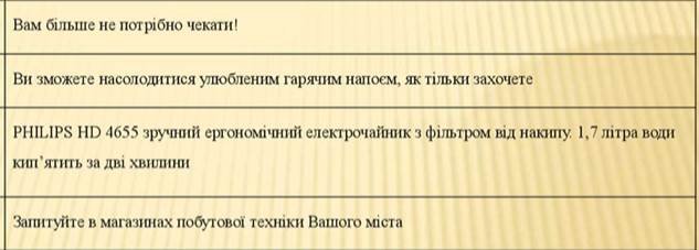 Проаналізуйте рекламне звернення і оберіть, який елемент зі структури в ньому відсутній