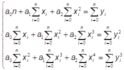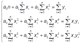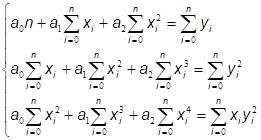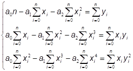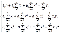Для квадратичної апроксимації методом найменших квадратів система для знаходження коефіцієнтів ,