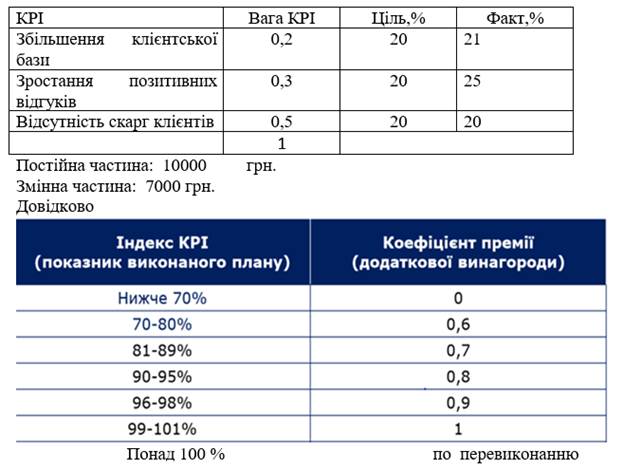 Розрахуйте розмір заробітної плати працівника на основі системи управління ключовими показниками продуктивності на основі даних, що подані в табл.
