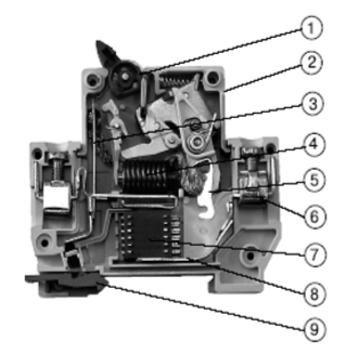 На малюнку показана схема автоматичного вимикача ВА-2002. Яка позиція відповідає електромагнітному захисту від КЗ?