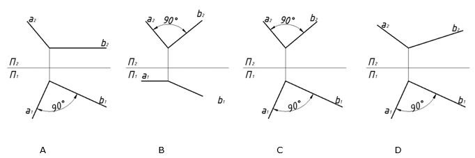 Вкажіть рисунок (рисунки), на якому прямий кут проеціюється в дійсну величину на площину проекцій.