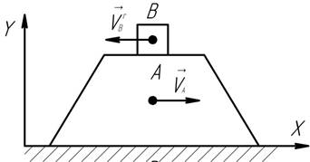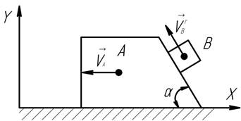 Визначити проекцію кількості руху механічної системи (в кг∙м/с ) на вісь Х в момент часу t=2c , якщо призма А рухається з швидкістю 4 м/с, вантаж В рухається по поверхні призми по закону м, 50 кг, 10 кг,.