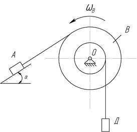 Визначити кінетичну енергію механічної системи, якщо блок В обертається з кутовою швидкістю 5 с-1,