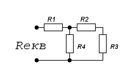 Знайдіть еквівалентний опір з’єднання Rекв, якщо R1=20 Ом R2=10 Ом R3=10 Ом R4=20 Ом