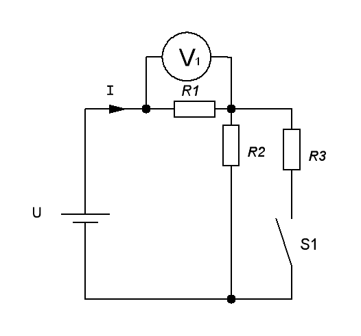 Як зміниться струм I (в нерозгалуженій ділянці кола) та спад напруги на резисторі R1 (покази вольтметра V1)після замикання ключа S