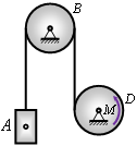 Для підйому вантажу A масою mA ( 500кг використовують двигун, який передає на вал D масою mD ( 100кг і радіусом R ( 0.2м сталий крутний момент M ( 1600Нм. Визначити суму робіт зовнішніх сил системи на момент часу, коли вантаж підніметься на висоту h ( 1.6м. Рух системи почався зі стану спокою, вал D та блок B вважати суцільними однорідними циліндрами (mB ( mD), масою троса знехтувати, g≈10м/с2.