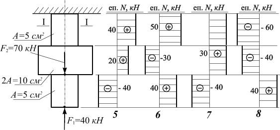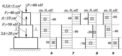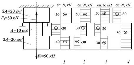 Вказати правильну епюру поздовжніх сил (еп. N) для заданого бруса