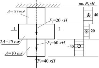 Визначити величину нормальної напруги ( , МПа) в перерізі бруса І-І (