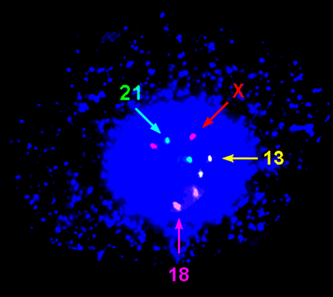 Az alábbi ábrán kromoszóma mutációra végeztek genetikai próbát [a nem (szex) meghatározáson kívül]. Miért pont ezeket választották? Milyen típusú mutációkra teszteltek? Mi a festési módszer neve?