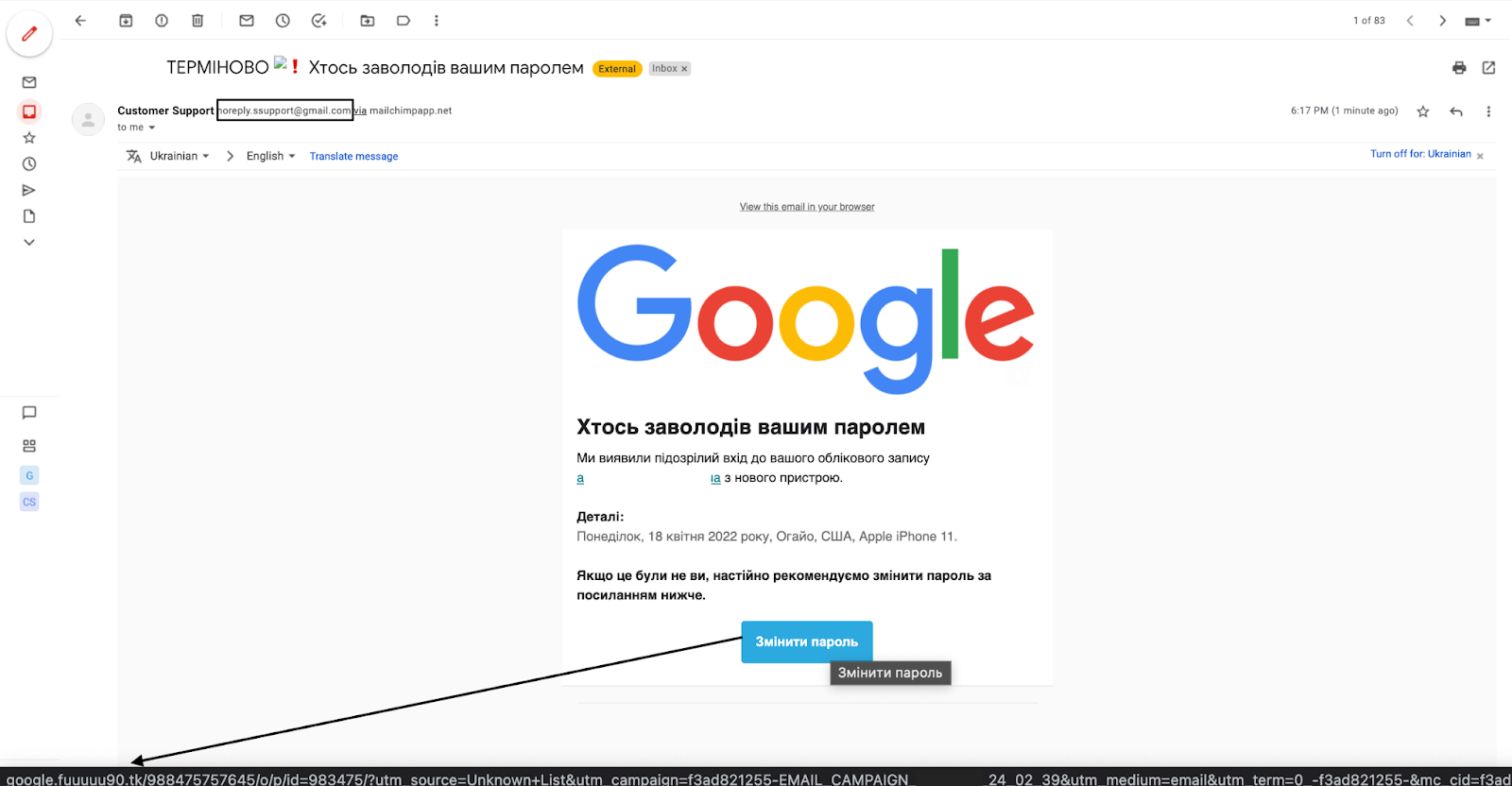 Вам надійшов електронний лист із закликом терміново змінити пароль вашого облікового запису. Які фактори можуть свідчити про те, що це фішинговий лист? Оберіть усі правильні відповіді.