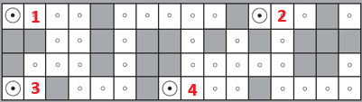 The robot can sense (observe) its surrounding walls, whether there is a wall in the north (N), south (S), east (E), or west (W). At the current position, the robot observed that there were walls in NSW. Thus, the possible current position of the robot might be one of the following positions (1, 2, 3, or 4):