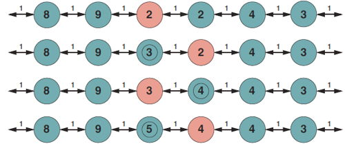 The following diagram shows the four iterations of Learning Real Time A* (LRTA*) on a one-dimensional state space. Each state is labeled with H(s), the current cost estimate to reach a goal, and every link has an action cost of 1. The red state marks the location of the agent, and the updated cost estimates at each iteration have a double circle. What will be the agent's move in the next iteration?